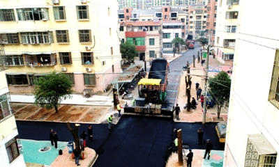 11月29日,咸安区温泉街道办事处岔路口社区绿叶小区,大型机械正在刷黑小区道路。