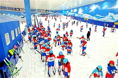 1月1日,位于咸安的际华园滑雪场内,游客有序排队参加相关项目。