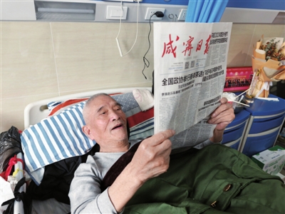 走进308病房,张向温老人正躺在病床上看报纸,虽然不能下床,但精神状态十分良好。看到有人来探望,他向大家敬了个军礼,并说:“感谢党和政府的关心,我身体恢复得很好。”