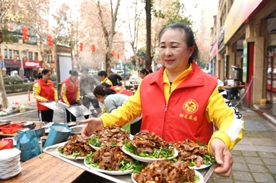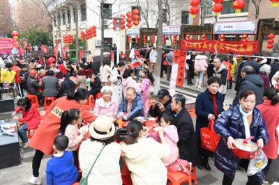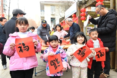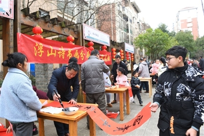活动现场,居民们从家中端来自家做好的拿手好菜,小区文艺爱好者们自编自演的节目轮番上场,浮山诗书画分会义务送春联近千副。