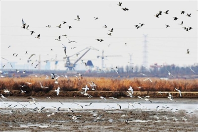 近日,成群候鸟在山东省青岛市城阳区河套湿地与冰海为伴云集觅食,青岛河套湿地地处胶州湾北岸,为鸻鹬类、雁鸭类越冬候鸟的重要栖息地。