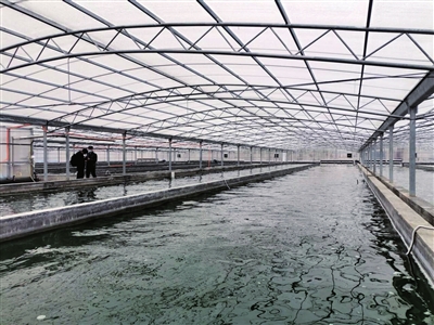 在螺旋藻培养温控大棚里,墨绿色藻液在机械浆叶带动下翻涌起伏,藻液通过管道与一旁的灵鲜螺旋藻食品厂联通,通过洁净采收后传入4条无尘生产线,制成不同产品。