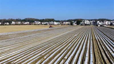 日前,在通城县关刀镇新畈基地,湖北寿福农业科技有限公司员工驾驶土豆播种机播种土豆。
