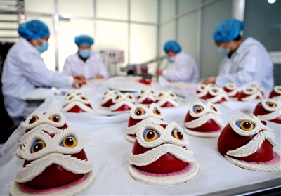 ◀1月22日,在山东省滨州市阳信县洋湖乡一家花馍生产企业车间,工人加紧赶制“醒狮龙”花馍供应年货市场。