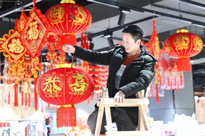 为满足市民春节购物需求,超市提前精心准备,红彤彤的灯笼和春联等新年挂件摆放在显眼位置,琳琅满目的年货供市民挑选。 记者 陈红菊 摄