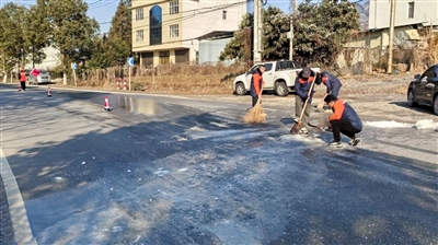 王全安在公路上巡查了30分钟左右,接到巡查养路工人的紧急电话,在省道S358(阳新富水——通山县城)下杨路段一处弯道,路面结冰,存在严重安全隐患,急需处理解决。接到电话,王全安迅速安排人员带上工具和融雪剂,驱车赶往现场,大家一起挥动铁锹和扫帚,铲雪、撒工业盐,40分钟就完成了险情处置。