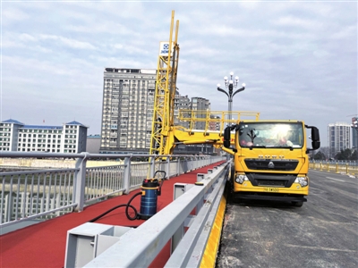 1月24日,记者来到崇阳四桥改建工程看到,大桥人行道、路灯已经全部安装完成,施工人员正在对人行道路面进行人行道防滑陶瓷颗粒铺设,安全检测车辆正在对大桥外部结构进行安全检测。