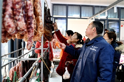 来到肉类区,猪、牛、羊肉色泽鲜艳,肥瘦搭配,可任意挑选,摊主根据顾客需求论斤称重,诚信买卖,让顾客买得称心如意。