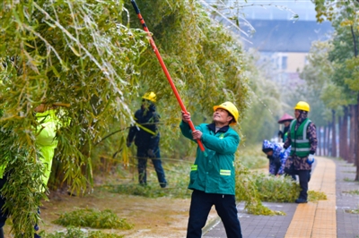 2月4日,记者在市区十六潭公园看到,园林工人正冒雪清理树枝,将被冻雨压弯了的树枝剪断,排除断枝隐患,保障行人安全。 记者 夏正锋 摄