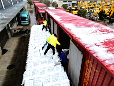 2月7日12时,首批满载除雪融雪盐的货车抵达咸宁,正在湖北中交咸通高速公路有限公司仓库内卸货。