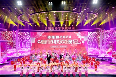 整场晚会分为山水韵、人文思、阳光路三个篇章。开场舞《吉祥龙年》拉开了联欢晚会的序幕。歌伴舞《瑶山谣》,唱出了古瑶民给我们留下的灿烂文化,歌声带现场观众探访古瑶民的足迹,寻觅历史的回声。武术太极古乐组合《力韵》,展示了我县市民强健好体魄,意志坚如钢。原创歌伴舞《古堰的爱哟古堰的恋》,唱出了崇阳人民对荣获世界灌溉工程遗产名录殊荣的崇阳白霓古堰深深地眷恋。旗袍秀《国风斗笠秀》,体现了我县女性英姿飒爽的独立风貌和个性形象。本土特色戏曲《双合莲》,以流传在崇阳的民间爱情故事为基础,在继承保护非遗文化的传统上,将崇阳县提琴戏传统曲调,融入现代元素改编创作而成。歌曲《灯火里的中国》,唱出了崇阳人民对党对祖国深深的爱,更唱出了老百姓对幸福生活的追求。《歌曲串烧》、《提琴新韵》、快板《崇阳黄精赛黄金》、舞蹈《栽禾鼓》、舞蹈《欢聚一堂》等节目精彩纷呈,高潮迭起,赢得观众阵阵掌声。伴随着歌曲《领航》的悠扬旋律,晚会落下帷幕。