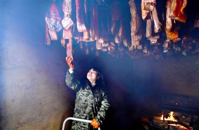 春节临近,通山县大畈镇长辉农产品有限公司熏房,工人正将熏好的腊肉取下,准备打包发往外地。