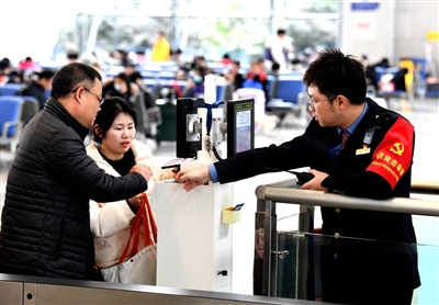 2月17日,咸宁北高铁站,工作人员一丝不苟,确保乘客安全有序出行。