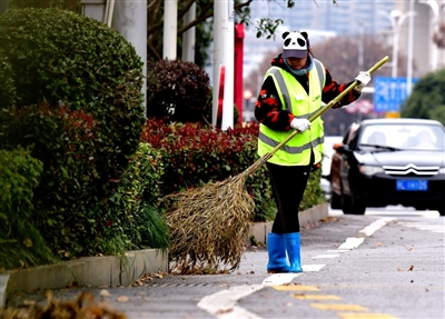 2月15日,银泉大道,环卫工人正在清扫路面。