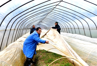 2月20日,咸安区马桥镇高赛村王家畈蔬菜基地,菜农在给育苗大棚加盖“棉被”。为应对新一轮雨雪冰冻天气,该镇在区农业农村局专家的指导下,加固了全镇90余户菜农的290余个大棚,并给部分大棚额外加了一床“棉被”,让菜苗能顺利度过此轮低温。