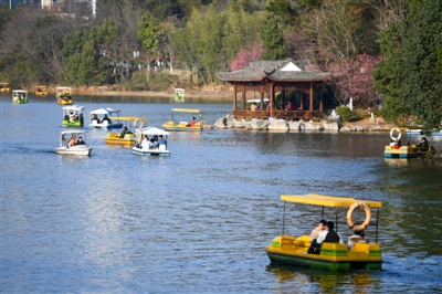 春节期间,家门口公园成为不少市民休闲娱乐的选择之一。那几天,记者在市人民广场、十六潭公园、青龙山公园看到,不少市民在公园内外游玩、散步,还搭起了帐篷,展现一派春意盎然的年味。