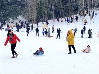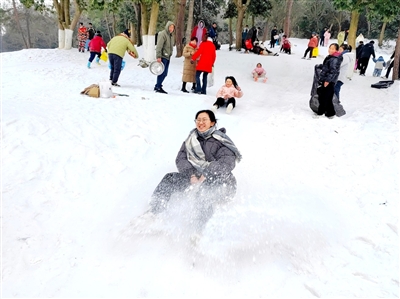 在十六潭公园,正带着孩子戏雪的王女士说:“好久没见到这么大的雪,看着孩子们在雪中玩耍,不禁回忆起儿时的美好时光,也忍不住和孩子一起在斜坡上享受了一把滑雪的快乐。”