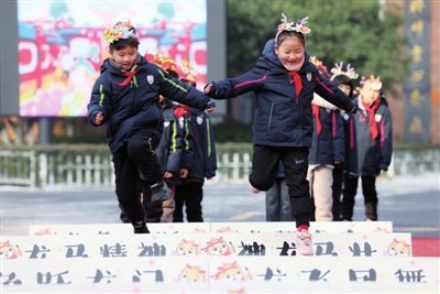 2月25日,在安徽省合肥市和平小学东校,孩子们佩戴龙年卡通头饰参加校园趣味运动,迎接新学期的到来。