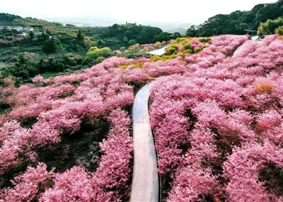 近日,龙岩漳平仁隔山花千谷樱花园大片大片的樱花树盛开在山坡上,漫山遍野美不胜收,密集而鲜艳,走入花海,如同走进春日油画里。
