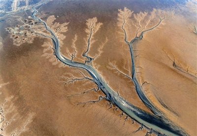 近日,江苏省启东市,黄海浅滩上现“潮汐树”。“潮汐树”是由潮汐涨落对滩涂反复冲刷形成,大自然的“鬼斧神工”造就壮美景观。(本报综合)