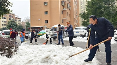 2月24日,咸安区温泉街道办事处岔路口社区越通美院小区,物业工作人员正和小区居民一起铲除道路上和车位旁的冰雪,保障雪后居民和车辆安全出行。