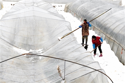 2月26日,咸安区马桥镇高赛村王家畈,蔬菜种植户王仁全夫妇在清理大棚上的积雪。