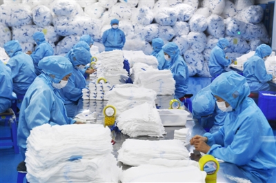 日前,湖北中健医疗用品有限公司,工人们在赶制医用防护用品。