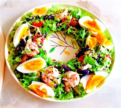准备一些藜麦、青虾、鸡蛋、生菜、紫甘蓝、圣女果、苦苣、沙拉酱。藜麦提前浸泡10分钟,煮20分钟备用,其他蔬菜清洗干净。青虾剥皮去虾线,入开水中煮一分钟捞出。紫甘蓝切碎烫一下捞出。生菜和苦苣切小块,圣女果对瓣切开放入大碗中。虾仁和藜麦放入大碗中。挤入适量沙拉酱拌匀。鸡蛋煮至蛋黄凝固切瓣,将拌好的食材摆入盘中即可。