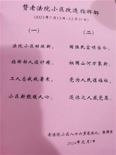 “小区改造好后,我越看越觉得这日子舒心、幸福!”面对老法院小区一系列更新改造的成果,退休老干部张国煌老人,还专程写了两首诗送到小区改造指挥部,以表谢意。