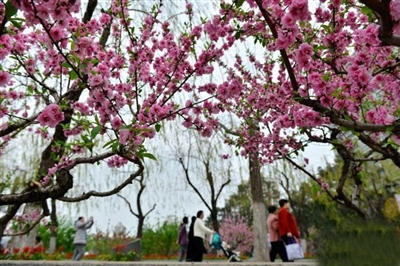 近日,福州西湖公园柳堤两侧百余株桃花灼灼盛开,桃红柳绿满园春色扑面而来,吸引许多市民、游客前来踏青赏花。