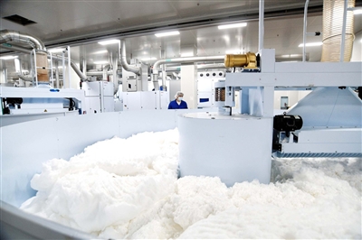 开松、梳理、烘干……一团团棉花原料被送上自动生产线,在历经多道工序后,变成医用耗材、消毒、灭菌、洗护、美妆等产品,最终销往各地。