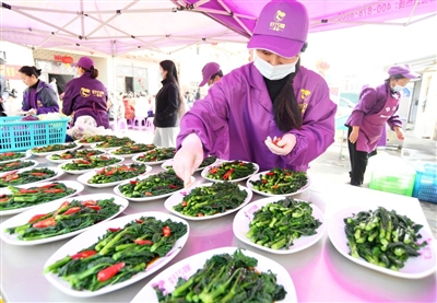 活动当天最吸引人的要数甘蓝宴和甘蓝新品种展示解说环节,甘蓝沙拉、白灼羽衣甘蓝、藕遇甘蓝、甘蓝饺子……公益团队好巧嫂家宴店店长李建英带着团队一早便开始忙活,以甘蓝元素为主的特色菜单让人目不暇接,甘蓝馅的饺子在制作环节就受到了众多村民的围观,紫色、绿色的甘蓝搭配瘦肉,让人垂涎欲滴。