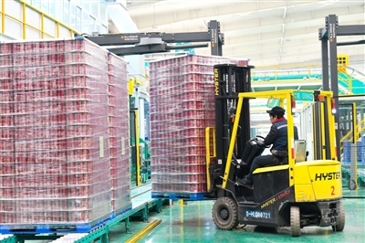 湖北奥瑞金包装有限公司车间内,工人驾驶叉车将产品从生产线转运至库房。近年来,奥瑞金湖北基地主要产值呈上扬趋势。记者陈红菊摄