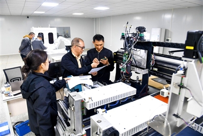 赤壁市万皇智能设备有限公司内,技术人员正紧张生产研发中。 记者 张仰强摄