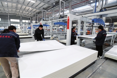 3月6日,嘉鱼县经济开发区湖北开杰新型环保材料有限公司车间内,一张张板材被分割成形制统一的长条。该企业产品主要用于工装和家装,目前10条生产线火力全开,第一批产品20个货柜将销往越南。目前,企业订单已经排到了6月份。 记者 陈红菊 特约记者 谢燕子 龙钰 摄