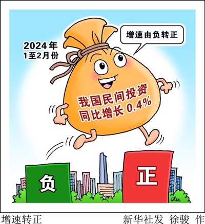 新华社北京3月19日电 随着各项宏观调控政策持续落地显效,我国民间投资增速由负转正。国家统计局日前发布的数据显示,今年1至2月份,我国民间投资同比增长0.4%,2023年全年为下降0.4%。