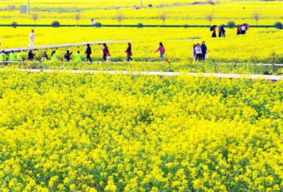 3月20日,咸安区马桥镇曾铺村建国畈油菜花海景区,金黄的油菜花海与错落的民房交相辉映,游客徜徉其间,构成了一幅美丽的乡村画卷。 记者 夏正锋 陈红菊 摄