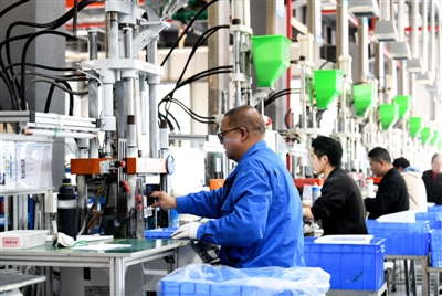 3月12日,通城县经济开发区湖北铱伦科技有限公司,工人在注塑成型车间有序生产。