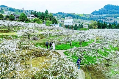 3月21日,在四川省达州市宣汉县庙安镇,万亩盛开的李花吸引了各地游客前来打卡拍照,如同给大地披上了一层白雪。