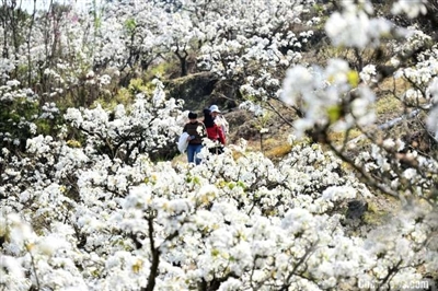 3月21日,位于成都大林的翠湖梨乡,上万亩梨花绽放,吸引游客前来踏青赏花。