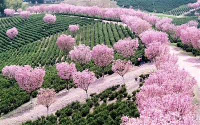 3月26日拍摄的十思园生态茶园景色(无人机照片)。春日时节,位于江苏溧阳的十思园生态茶园樱花绽放。 据新华社