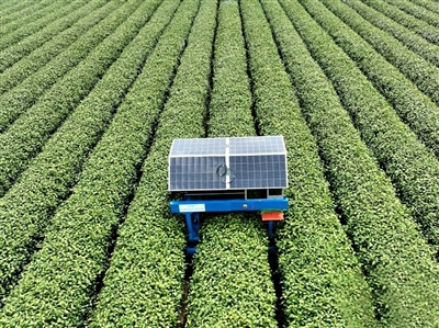 3月26日,智能采茶机器人在龙井茶园内采摘新茶。近日,随着浙江杭州明前西湖龙井茶开采,多台具备AI视觉识别、机械臂采摘等功能的智能采茶机器人“上班”采新茶。