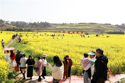 3月20日,在杨狮坑村千亩油菜花海,金黄的油菜花在春日微风中荡漾,游客们三五成群,或围绕打卡墙拍照赏花,或在阡陌纵横的花田里奔跑嬉戏……