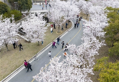 图③:3月31日,人们在江苏泰州职业技术学院观赏樱花(无人机照片)。