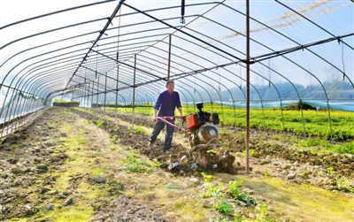 4月2日,赤壁市蒲圻街道办事处望山社区9组,当地菜农正在大棚内翻耕,准备移栽菜苗。