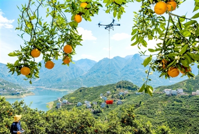 4月8日,湖北省宜昌市秭归县郭家坝镇邓家坡村技术人员在田间用无人机转运红肉脐橙。