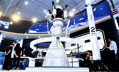 4月23日,参观者在航天产业成就展区参观火箭发动机模型。