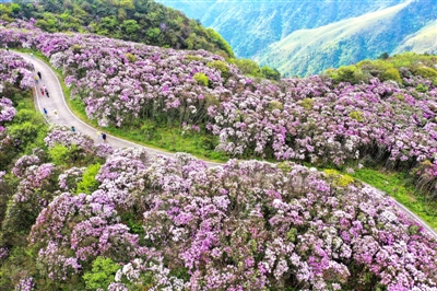 4月26日,游客在湖南省永州市双牌县阳明山国家森林公园杜鹃花海景区赏花游玩(无人机照片)。 暮春时节,人们来到户外赏花游玩,享受美好春光。