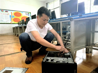 首先是信息技术的应用。闲暇时喜欢钻研信息化教学的他主动请缨担任微机室管理员,在繁忙的教学工作之余又扛起了新的职责:维修学校电教设备。