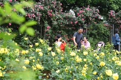 慕名而来的游客陶醉于花丛中,纷纷拿出手机拍照留念,定格美好时光。游客何女士与姐妹们边拍短视频边赏花玩乐,“现在月季开得正盛,非常漂亮。景区离县城不远,今天趁着假期约着几个好姐妹就过来了,真的不虚此行。”